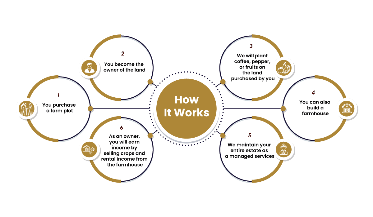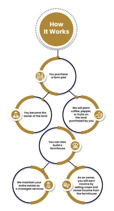 Invest in Vanasya Farmplots for prime agricultural land with coffee and pepper cultivation. Enjoy comprehensive estate management and income from crop sales and farmhouse rentals.